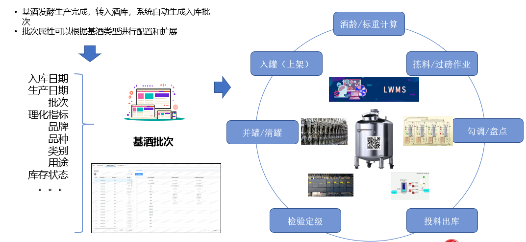 基酒从窖池发酵生产完成,到转入酒库后,系统自动生成初始入库批次,后续基酒经过库内加工生产、储存窖藏等环节后形成成品散酒,系统能够实现基酒全生命周期履历管理、批次管理和生产过程追踪追溯;